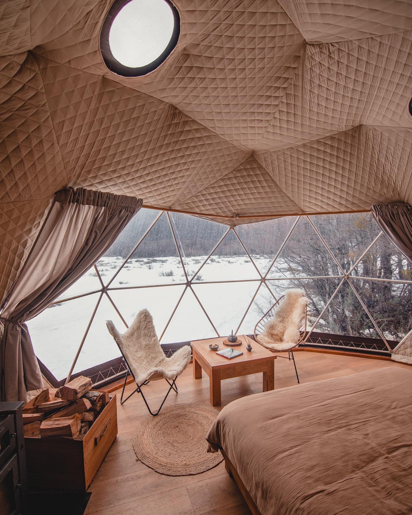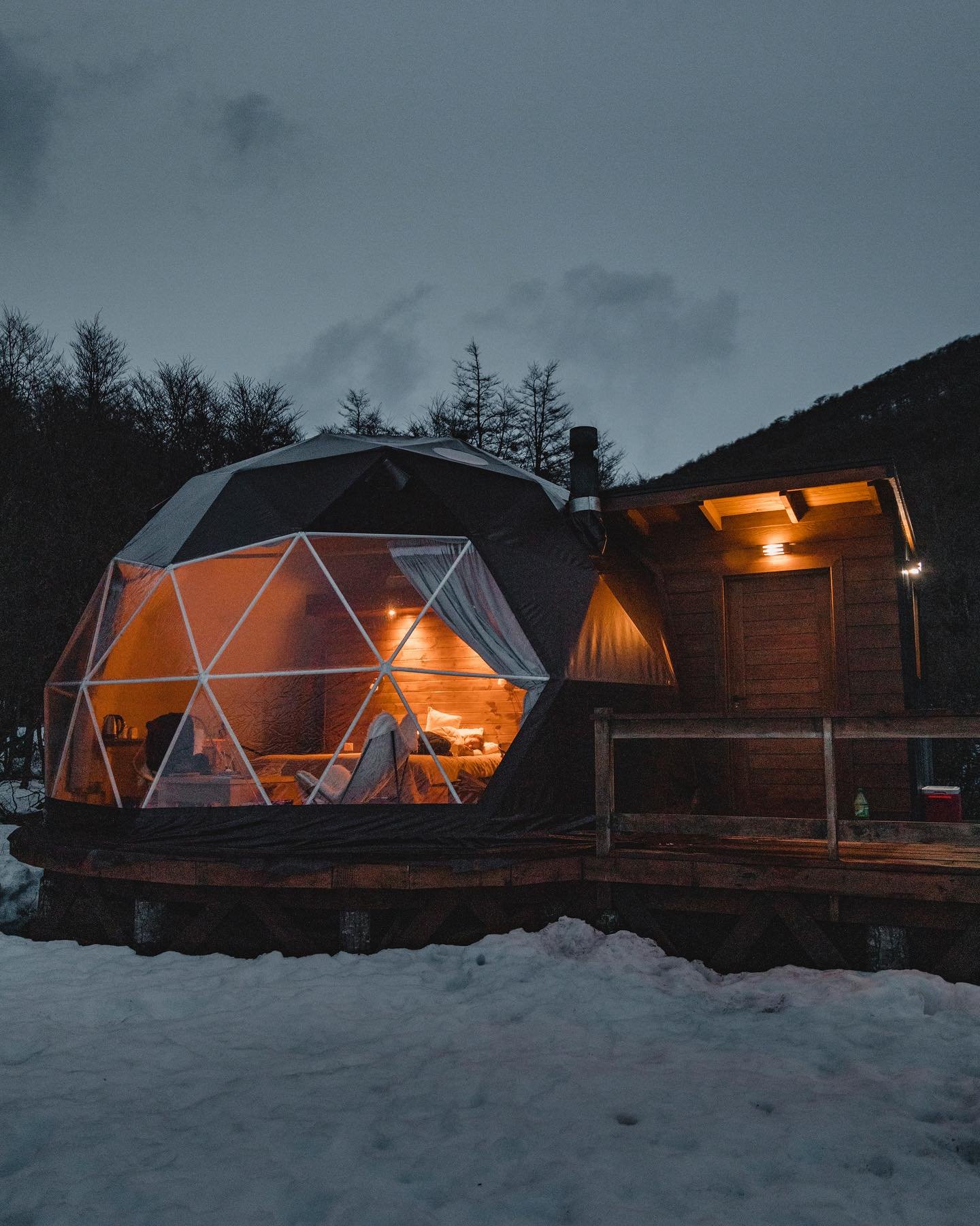La propuesta combina la magia de estar de camping en un entorno natural sin igual, con todas las comodidades que ofrece la hotelería. A continuación, te mostramos tres opciones para disfrutar al máximo de los paisajes del sur pintados de blanco.