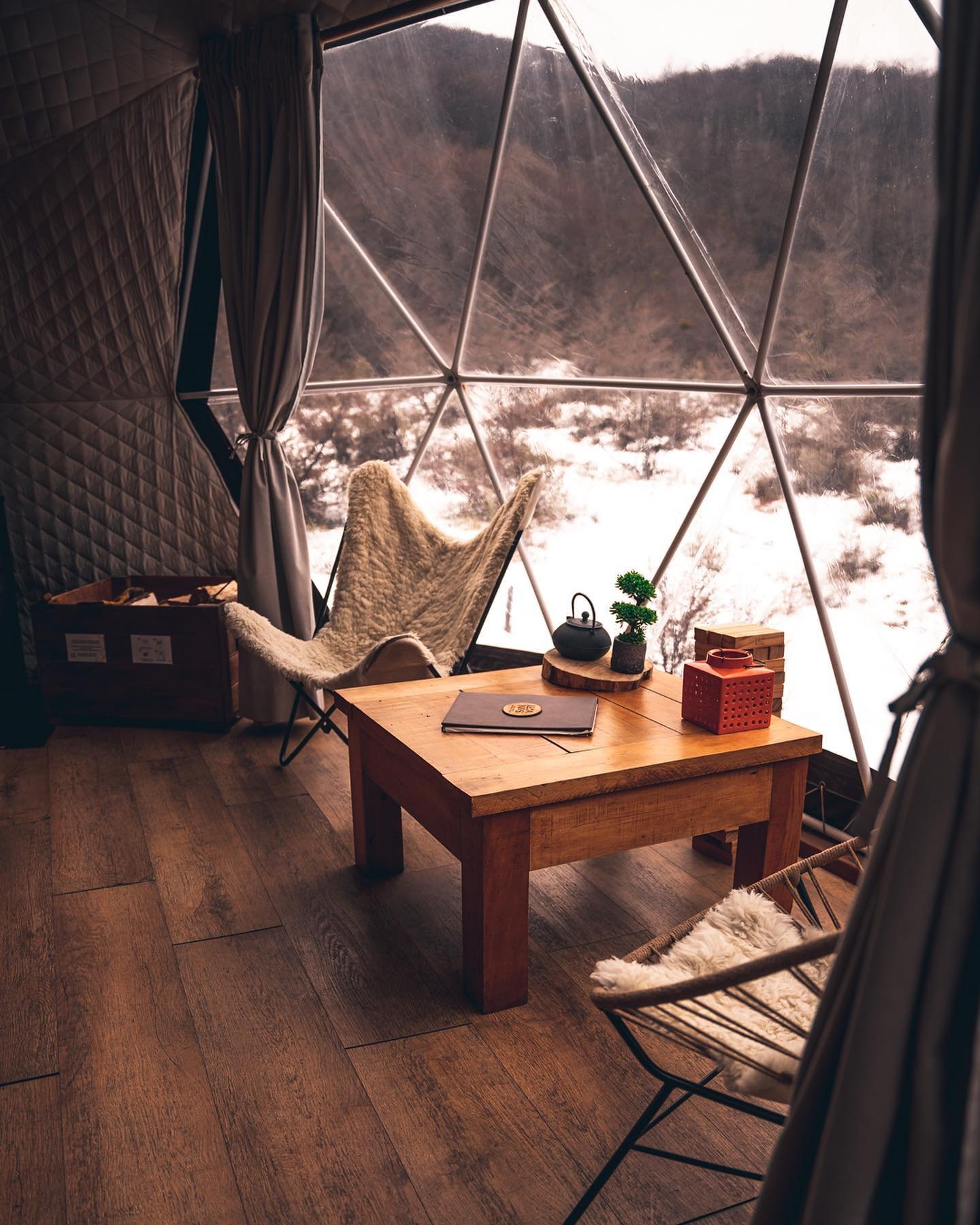 El lugar cuenta con 4 domos con distintas capacidades y equipados con cómodas camas dobles e individuales, calefacción y baño privado con ducha de agua caliente. Ofrece vistas espectaculares de los valles y ríos, con uno de los dominios esquiables extensos de la región.