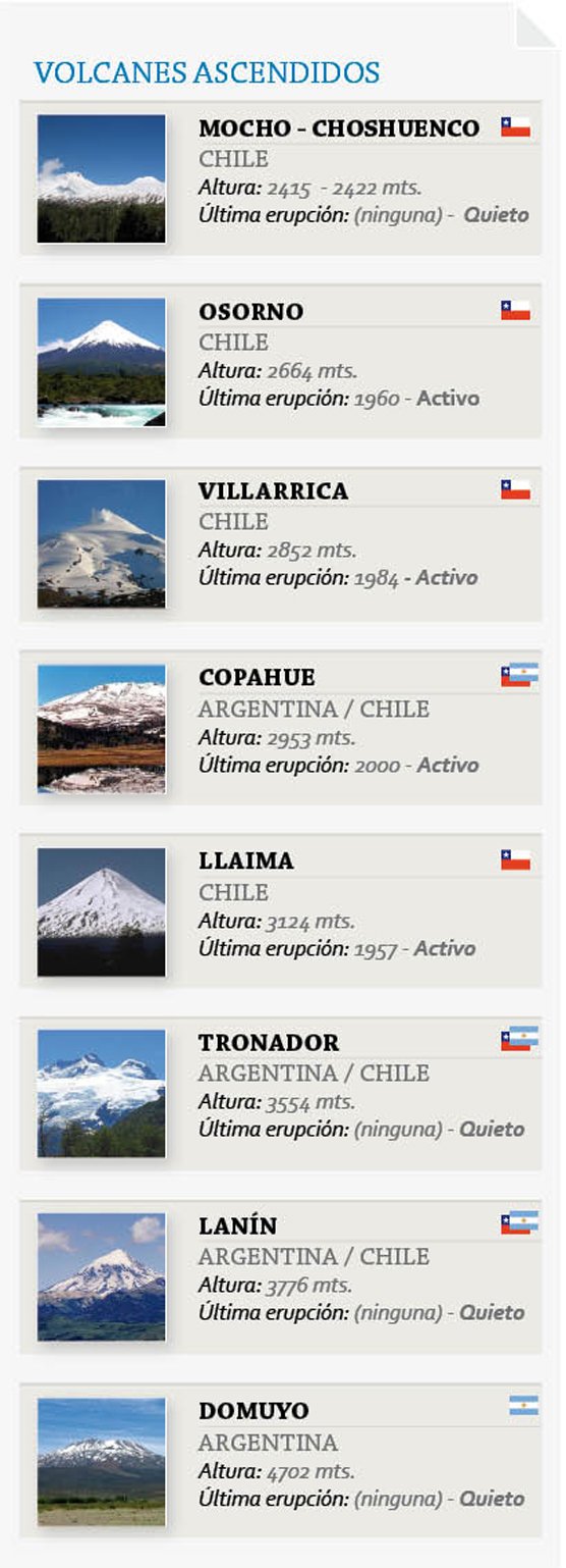 La Patagonia propone imágenes y relatos que se transforman en romances eternos. Con esa mezcla fatal de belleza, peligro y aventura, los volcanes son algunas de las marcas registradas de la región. Un proyecto llevado adelante por Francisco Bedeschi implica no sólo fotografiar desde el aire a veinte de ellos. La idea, además, es hacer cumbre en todos. Hasta el momento el equipo ha subido a ocho: Domuyo, Copahue, Llaima, Villarrica, Lanín, Mocho-Choshuenco, Tronador y Osorno. Fragmentos de una historia asombrosa.
