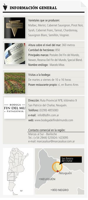 En la actualidad Bodega del Fin del Mundo, la primera de todas en instalarse definitivamente en la Patagonia, realiza sus cosechas manualmente entre principios de febrero y fines de abril o comienzos de mayo, y sus racimos, habitualmente, se acopian en cajas de 20 kilogramos. Entre sus principales etiquetas aparecen Fin (en sus variedades Malbec, Pinot Noir, Cabernet Sauvignon, Cabernet Franc y Tannat), Special Blend, Gran Reserva, el espumante Extra Brut del Fin del Mundo o el Cosecha de Mayo semillón. Bajo la atenta mirada del enólogo Marcelo Miras, Bodega del Fin del Mundo cuenta con cepas Sauvignon Blanc, Chardonnay, Cabernet Sauvignon, Malbec, Merlot, Pinot Noir y Syrah; la bodega construyó su propio y extenso canal de riego y, entre otros detalles de avanzada, tanques de acero que ocupan una superficie de 15 mil metros cuadrados.