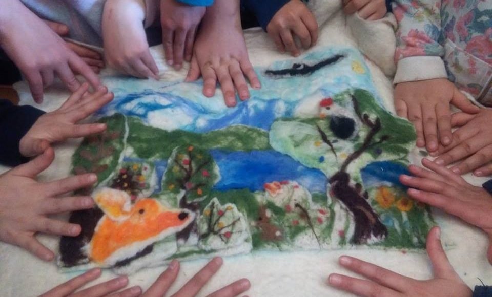 “Amamos y compartimos nuestro Parque Nacional Nahuel Huapi” es el nombre del dibujo realizado por los chicos de la Escuela La Semilla. “Es una representación original de un paisaje del Bosque Andino Patagónico, con sus lagos y montañas perfiladas de formaciones boscosas donde se adivinan elementos característicos de la ecorregión como lengas, un ciprés de la cordillera y calafates. Además, se incorporan hierbas como el amancay de flores amarillas. Entre la fauna, el cóndor planea en lo alto, un ciervo; que bien podría ser un pudú; asoma su cabeza y un ave posada observa de perfil. Igualmente, se incorpora la figura de una liebre europea, animal exótico común en la región. La técnica empleada de fieltro amasado y agujado es novedosa en el marco del concurso con un resultado bien logrado donde prevalece el trabajo en equipo”.