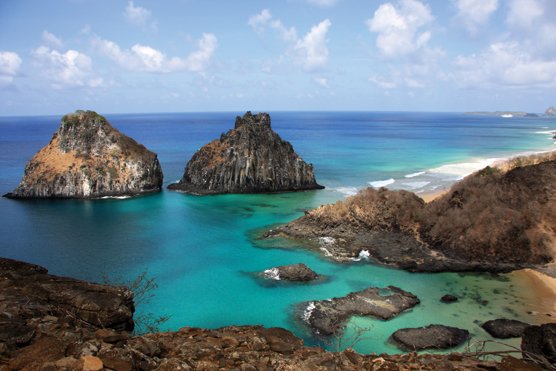 El archipiélago brasilero de Fernando de Noronha, formado por 21 islas, está perdido en el Atlántico, a 525 kilómetros de Recife y 350 de Natal, fue intermitentemente ocupado por ingleses, franceses y holandeses, antes que Portugal lo retomara definitivamente en 1737 y construyera 10 fortalezas para su defensa. Desde entonces fue utilizado como prisión y como base militar estadounidense durante la Segunda Guerra Mundial, hasta convertirse hoy en un territorio turístico preservado, en el que impera una saludable filosofía de conservación ecológica. Está estrictamente prohibido levantar una piedrita, ya sea de un sendero o del fondo del mar. Fernando de Noronha es un área de Preservación Ambiental (30%) y Parque Nacional Marino (70%) reconocido por la UNESCO como Patrimonio de la Humanidad.La isla mayor, de 10 kilómetros de longitud, es la única que está habitada. Apenas dos mil moradores permanentes y un máximo de 300 turistas (que deben pagar una tasa de preservación de 40 reales por día) tienen el privilegio de disfrutar de un ecosistema perfectamente equilibrado, donde se destacan 26 playas paradisíacas, impolutas y prácticamente desiertas. De ellas sobresalen tres: Baía Do Sancho, Baía Dos Porcos y Praia Do Leao, consideradas las mejores playas de Brasil.