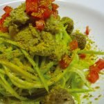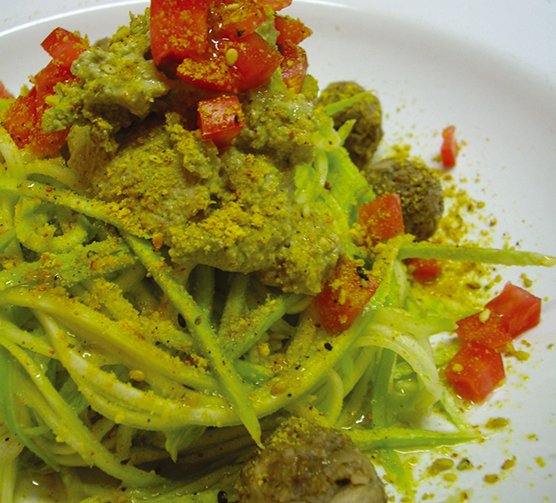 PRINCIPAL Spaghetti de zucchini, pesto de rúcula y girasol.
