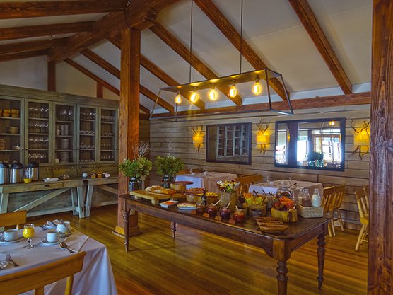 En términos específicos, en el hall de acceso se agregaron dos inmensos troncos de arrayán que enmarcan la recepción y se amplió la sala de los guías, que ganó en importancia. “El living se armó en torno a la gran chimenea revestida en piedra que organiza y distribuye sus tres estares, dándole calidez a través de un sofá de cuero. El resto de los sofás se hicieron en telas con ricas texturas y complementos como sillas de mimbre, sillas recicladas y alfombras de la antigua fábrica artesanal de Puyuhuapi”, puntualiza Aguirre Arellano.