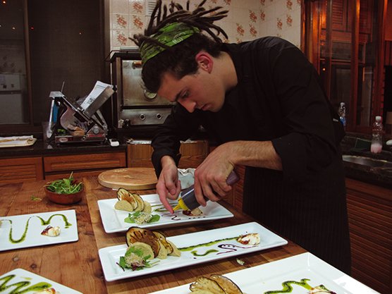 Ambos, cada cual con su función, son capaces de poner sobre la mesa exquisiteces como las siguientes: a modo de entrada sushi, confit de conejo, lomo con manteca de cítricos y queso brie, combinado con higos, zapallo en almíbar y batatas. O capeletis de queso de cabra, calabaza, café, paté de conejo con jalea de membrillo y queso Filadelfia. Otra variante de cualquier noche puede ser el confit de cordero confitado con hierbas patagónicas envueltos en hojas de parra, acompañado con ensalada de cereales y frutos secos, emulsión de ajos asados y una reducción de Merlot.