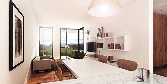 El proyecto adopta un estilo contemporáneo en cuanto a su disposición en el terreno y a nivel arquitectónico: “Los módulos de departamentos resueltos en una escala domestica, con proporciones agradables, buscan siempre las mejores visuales, que quedan encuadradas en su interior por aventanamientos que van de piso a techo, categorizando los interiores”, añaden.