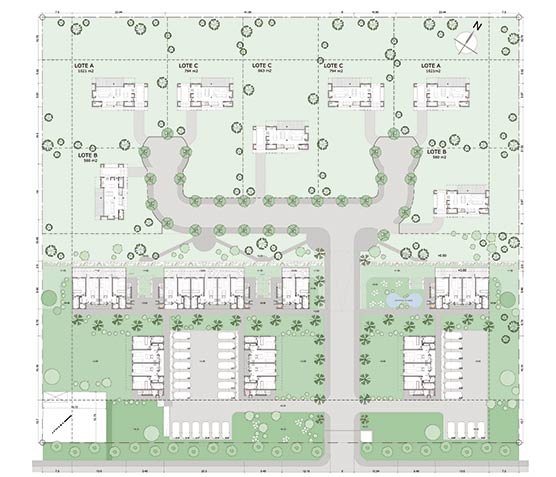 Estos departamentos se disponen de manera atomizada en células de diferentes tamaños, que agrupan 2, 4 y 6 departamentos por módulo. Estas unidades se implantan en el terreno priorizando las mejores orientaciones (Norte y Este) Esta distribución en diferentes módulos habitacionales potencia los espacios verdes exteriores: todos los departamentos, y sus extensiones privadas, “miran” a esos espacios verdes.