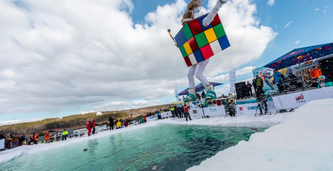 Se trata de un evento en el que los integrantes –disfrazados– de cada equipo se deslizan por una rampa y vuelan hasta llegar al otro lado de una pileta de agua helada…o caen dentro de ella. No importa el nivel de snowboard o esquí, sino las ganas de divertirse.