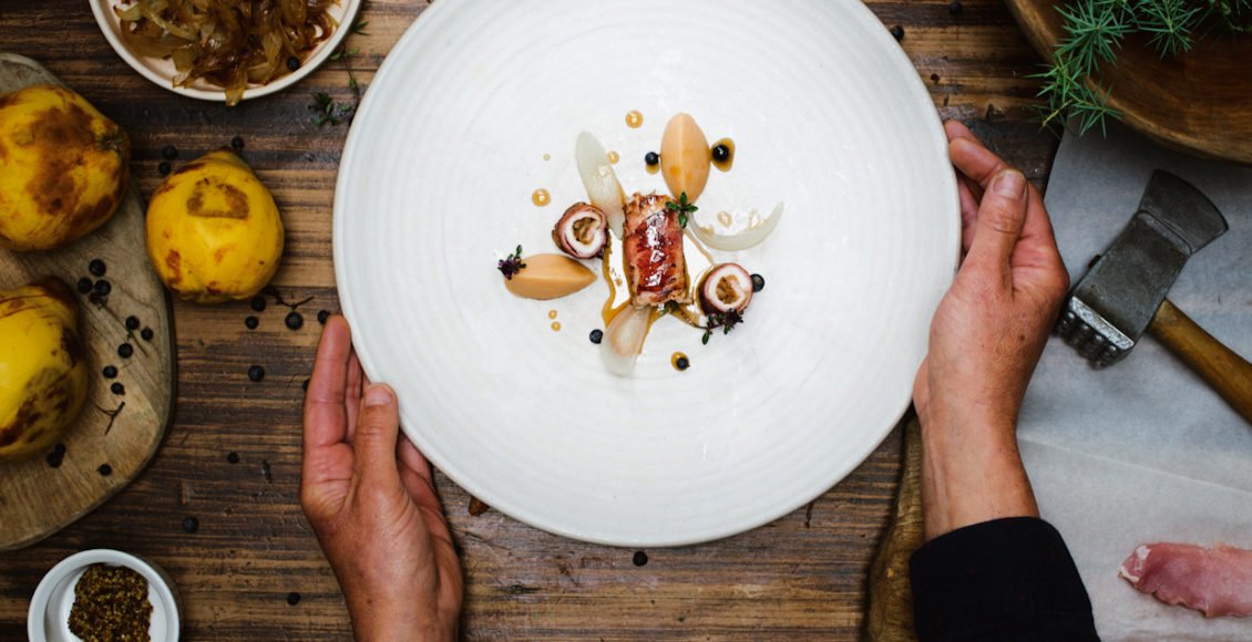 Retirar el cerdo del horno y servir acompañado de batatas doradas, puré de membrillos y cebollas horneadas. Salsear y decorar con pétalos de tomillo.